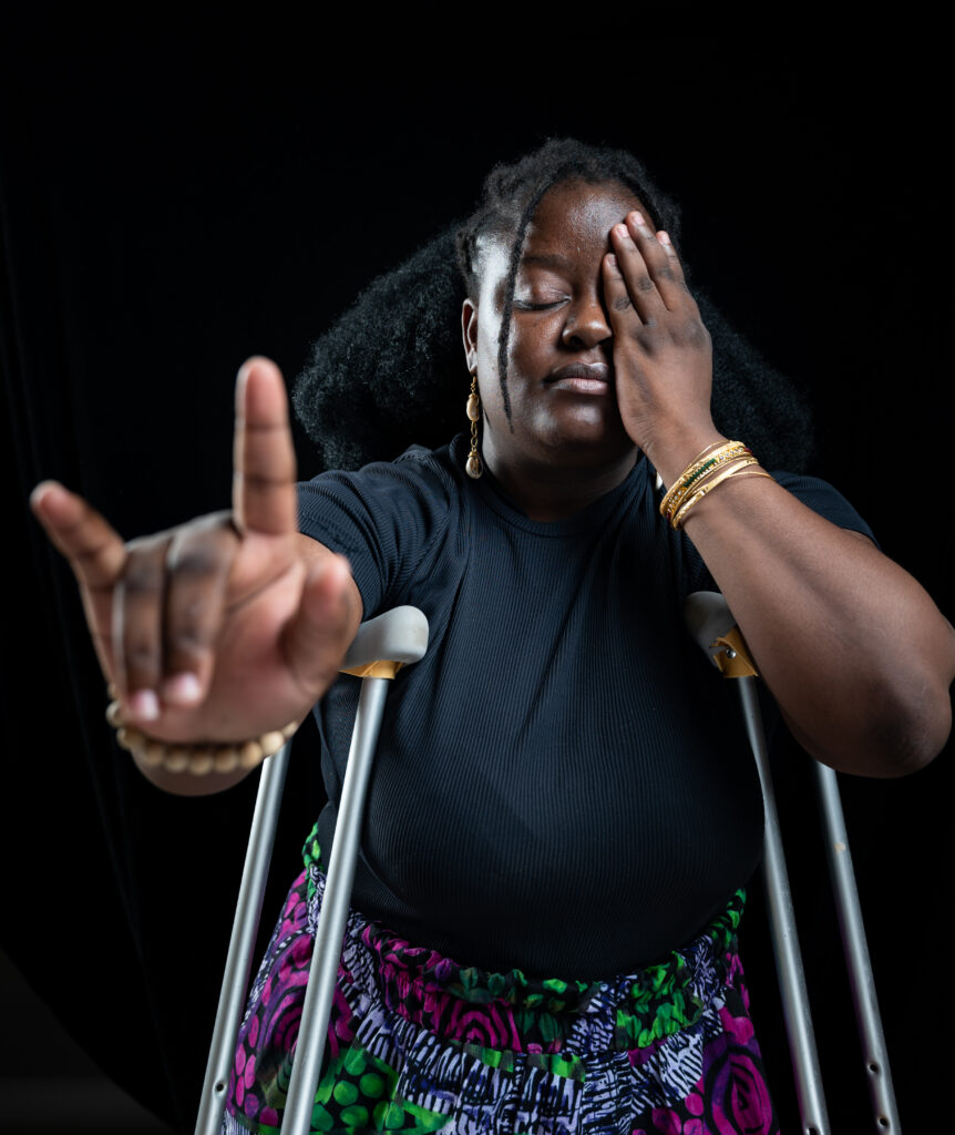 Pelemo stands confidently using crutches, wearing a black top and vibrant patterned pants in shades of green, purple, pink, and white. She covers one eye with her left hand while making the “I love you” sign in American Sign Language with her right hand. She wears bracelets and earrings, and poses against a dark studio background.