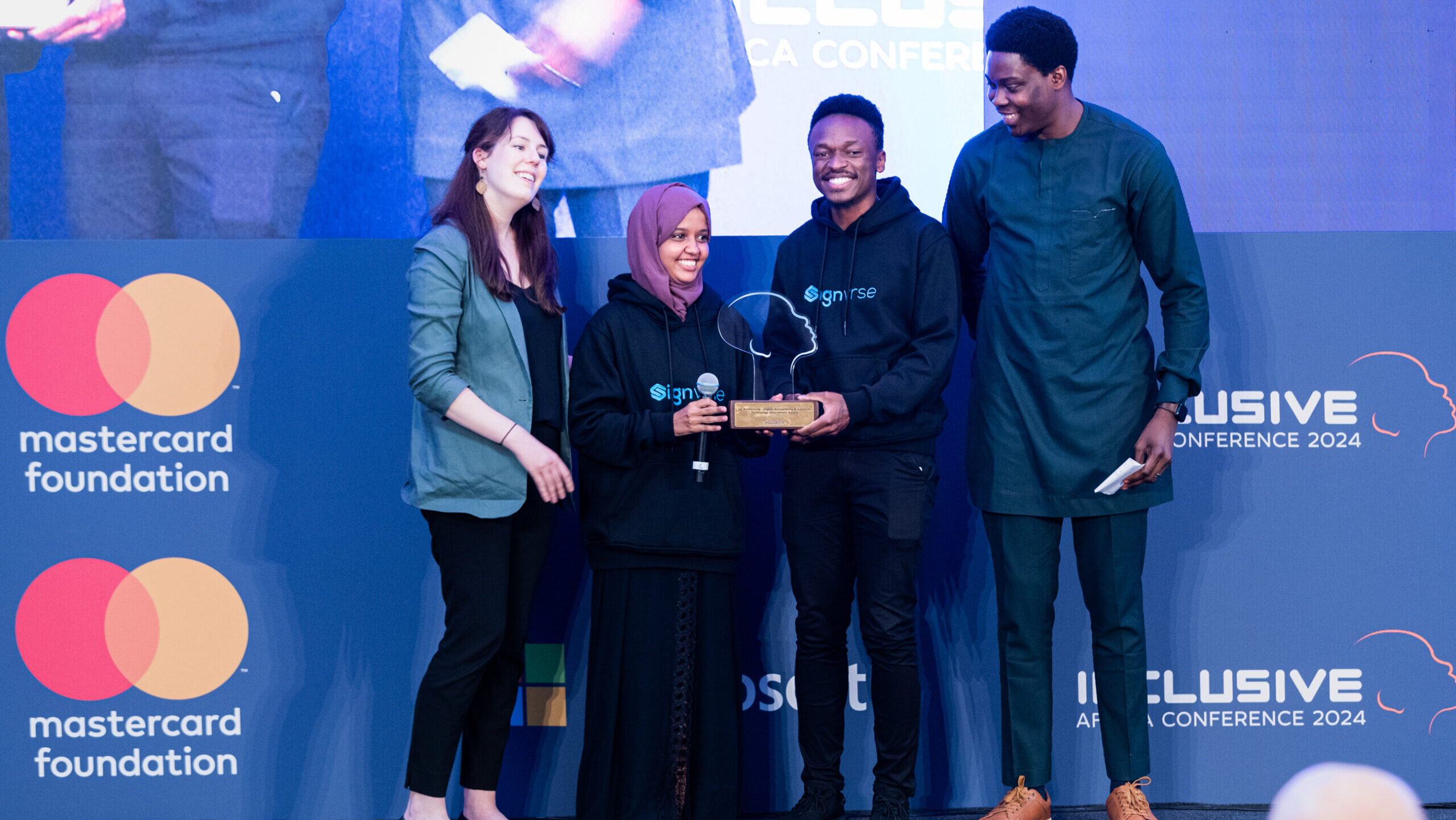 From left to right: Princely Kesah, DJ Wiwa and Wiwa's sister and caregiver Pauline Muchiri. DJJ Wiwa is handing over an award to Kesah at the 2024 Inclusive Africa...